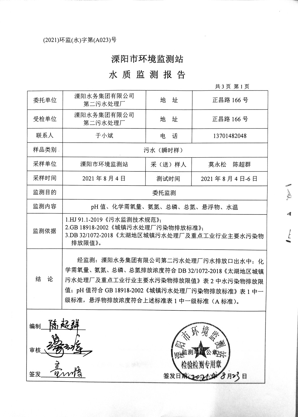 污水水质监测报告(2021年8月4日)